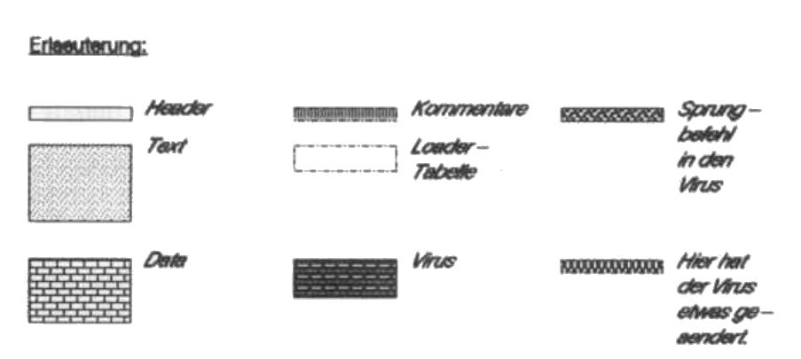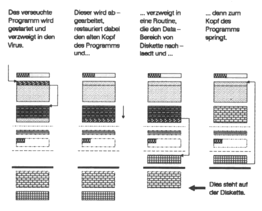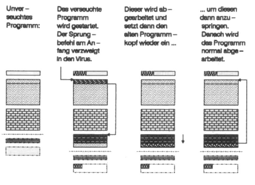 Aber echte Computer-Viren verraten sich im Gegensatz zu Milzbrand nicht durch die Än derung der Programmlänge. Die Arbeitsweise eines solchen Virus ist in der Abbildung sche matisch dargestellt.